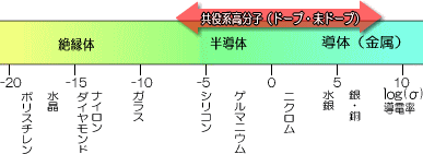電気を通すといってもその程度によって、導体(金属)、半導体、絶縁体などといくつかの種類に分かれる。電気をどのくらい通すかという目安に「導電率」というものがあるが、導電性高分子を含む様々な素材の導電率についての図を下に示した。