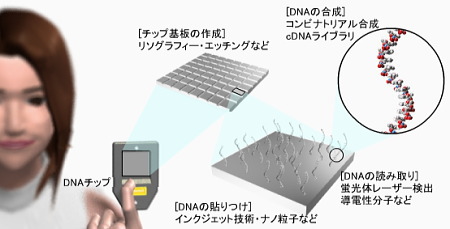 DNAチップの発現パターンを測定するためには、DNA断片に取り付けられた蛍光体をレーザーなどで検出するという方法が一般的である。しかし、この方法では検出器などがおおがかりで高価になるという欠点がある。そこで蛍光体ではなく、対をつくったDNA鎖だけに導電性の分子を結合させて、電気信号として発現パターンを読み取るという手法も研究されている。