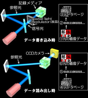 このCCDカメラによって検出されたデータページ(C)は、0と1のデジタルデータ(D)に変換され、最終的にもとのデータ(E)が再現される。ホログラフィックメモリは、データページという単位で読み出しをしているので、光の照射を一回行うだけで、何千、何万ビットというデータを一度に読み出すことが可能になるのだ。従来のCD・DVDなどの光ディスクやハードディスクなどはバラバラにされたデータをセクターごとに検索しているのに対し、ホログラフィックメモリはコンテンツごとにデータページとして保存されているので、データのアクセスの速度にも有利なのだ。これが、ホログラフィックメモリのデータ読み出しの高速な理由である。