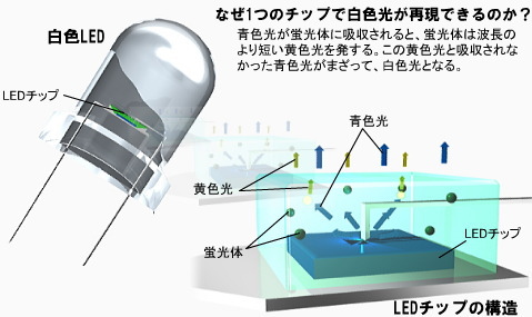 蛍光体は,青色光を黄色の光に変換する。発光ダイオード・チップ(GaN)が放射する青色光の一部は蛍光体層を透過し,残りは蛍光体に当たって黄色の光になる。この2色の光が混ざり合って白色に見える。(下図参照)