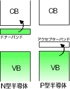 では、N型/P型半導体のように不純物を加えたとき、エネルギーバンドはどのように変化するだろうか?N型/P型半導体のエネルギーバンドを下の図に示した。