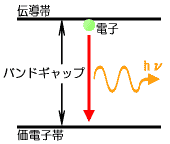 半導体の種類と光の関係について考えるとき、目安となるものがある。それは半導体のバンドギャップエネルギーだ。実際はこれほど単純でないにしろ、伝導帯の電子が価電子帯に落ちたときに発せられる光のエネルギー(つまり光の色)は、そのときのバンドギャップの大きさと関係がある。