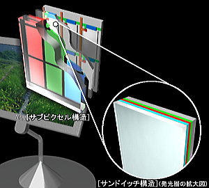 まずスクリーン上の1ピクセルを構成しているのは、図にあるようなサブピクセル構造である。このRGB色を組み合わせることで1ピクセルの色彩を調整している。さらにサブピクセル構図の発光層を拡大すると図のようにサンドイッチ構造になっている。簡単に説明するとサンドイッチ構造は、有機分子発光層を二つの電極で挟んだかたちとなっている。(有機ELディスプレイの構造の詳しい説明は「有機ELディスプレイ」のほうを参照)