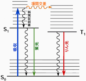 励起三重項状態(T1)」と呼んでいる。T1からS0へ戻るときに、差分のエネルギーがりん光として放射される。