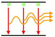 普通の場合、励起した原子や分子によって発せられる光は、いろいろな位相や方向を持っているのが普通だ。ところがある条件下では、一つの電子が再結合したときの光が引き金となって、別の電子の再結合が後に続くことがある(下図)。これにより、2番目の再結合は、一つ目の光と正確に等しい位相を持った同一波長の光が発生する。この現象を「誘導放射」と呼んでいる。この誘導放射が何度も続けば、位相の整った強い光をえることができる。