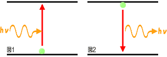 熱や光など何らかの拍子で、原子や分子でエネルギーの低い軌道にあった電子がエネルギーの高い軌道へ励起される(excited)ことがある。(図1)その電子が再びエネルギーの低い軌道に下りてくる(ホールと再結合する)場合、その差分のエネルギーは光として放出される。(図2)